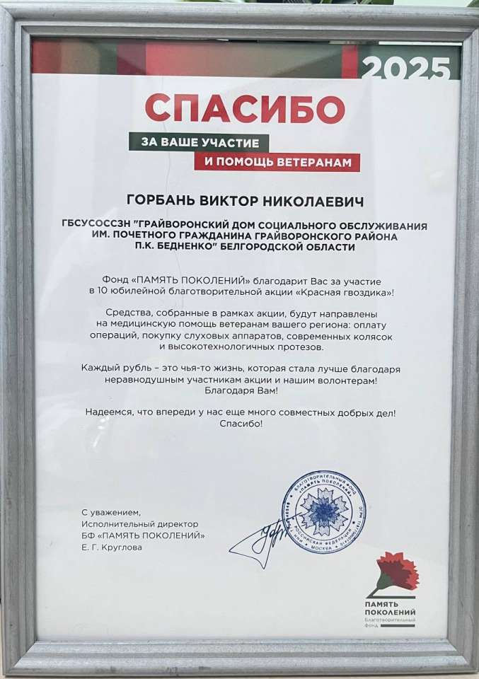 К Дню Конституции Российской Федерации в историко-краеведческом музее, прошло мероприятие, на котором коллектив Грайворонского дома социального обслуживания им. П.К. Бедненко, в лице руководителя Горбань В.Н., был награжден за активное участие в десятой юбилейной благотворительной акции «Красная гвоздика».